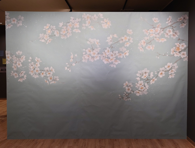 襖絵の技法を「壁紙」へと展開したその視点は単なる装飾を超え、空間そのものを「場のための絵画」へと変貌させる新たな可能性。大画面の前に立つと、あたかも桜の樹下に身を置いているような没入感があり、その美しさと迫力に圧倒される、感銘深い絵画展でした。